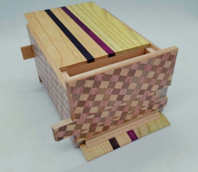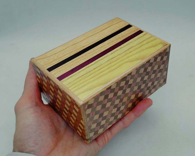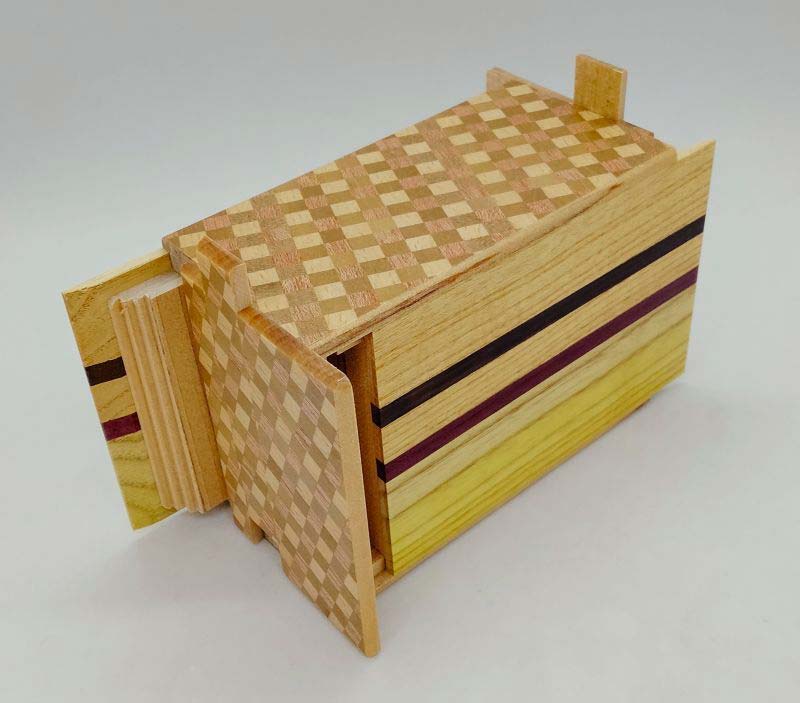 Die japanische Trickbox Himitsu Bako 4.2 Sun 27 Steps Natural Wood / Ichimatsu. Himitsu Bako ist Japanisch und steht für "Geheimkasten". Die Box wird aus Holz in Handarbeit hergestellt und kann nur geöffnet werden, indem einzelne Elemente der Box in einer bestimmten Reihenfolge verschoben werden.