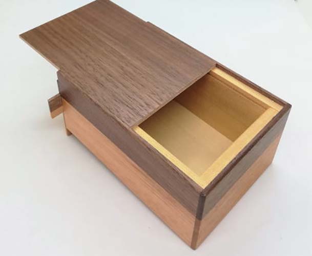 Die japanische Trickbox Himitsu Bako 5 Sun 7 Steps Walnut Wood: Himitsu Bako ist Japanisch und steht für "Geheimkasten". Die Box wird aus Holz in Handarbeit hergestellt und kann nur geöffnet werden, indem einzelne Elemente der Box in einer bestimmten Reihenfolge verschoben werden.