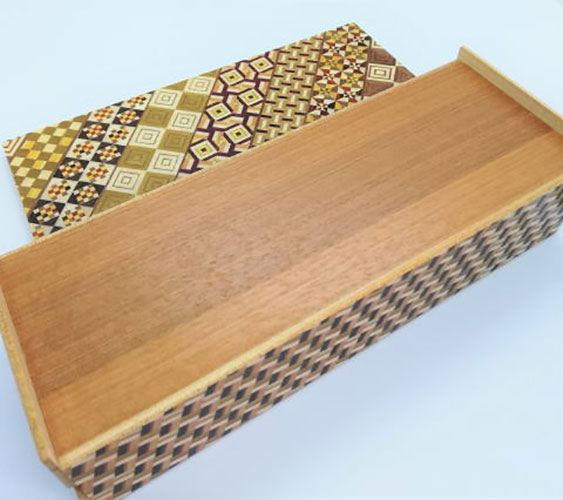 Die japanische Trickbox Himitsu Bako 8 Sun Long Cube 14 Steps Yosegi / Kuzushi: Himitsu Bako ist Japanisch und steht für "Geheimkasten". Die Box wird aus Holz in Handarbeit hergestellt und kann nur geöffnet werden, indem einzelne Elemente der Box in einer bestimmten Reihenfolge verschoben werden.