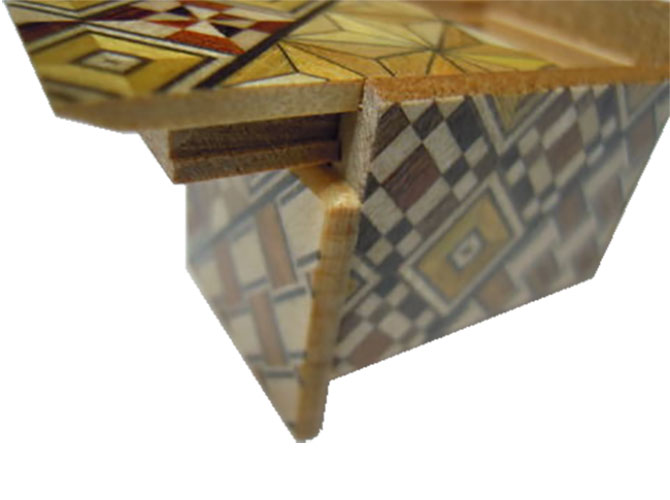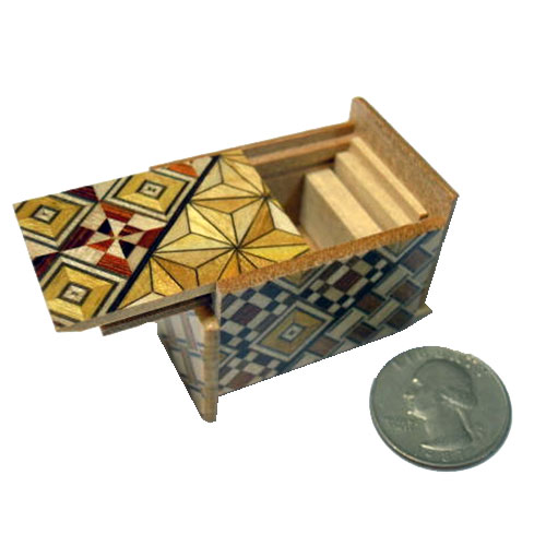 Die japanische Trickbox Himitsu Bako Mame 10 Steps Yosegi: Himitsu Bako ist Japanisch und steht für "Geheimkasten". Die Box wird aus Holz in Handarbeit hergestellt und kann nur geöffnet werden, indem einzelne Elemente der Box in einer bestimmten Reihenfolge verschoben werden.