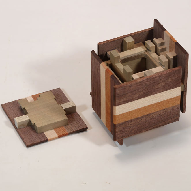 Die Karakuri New Secret Box II ist eine hochwertige Japanische Puzzlebox, die man in zwölf Schritten öffnen kann. Zum Schließen werden ebenfalls zwölf Schritte benötigt. Die ca. 8 x 8 x 8 cm große Box hat im Inneren einen kleinen Hohlraum von ca. 3 x 3 cm. Eine Lösung liegt der Box bei.