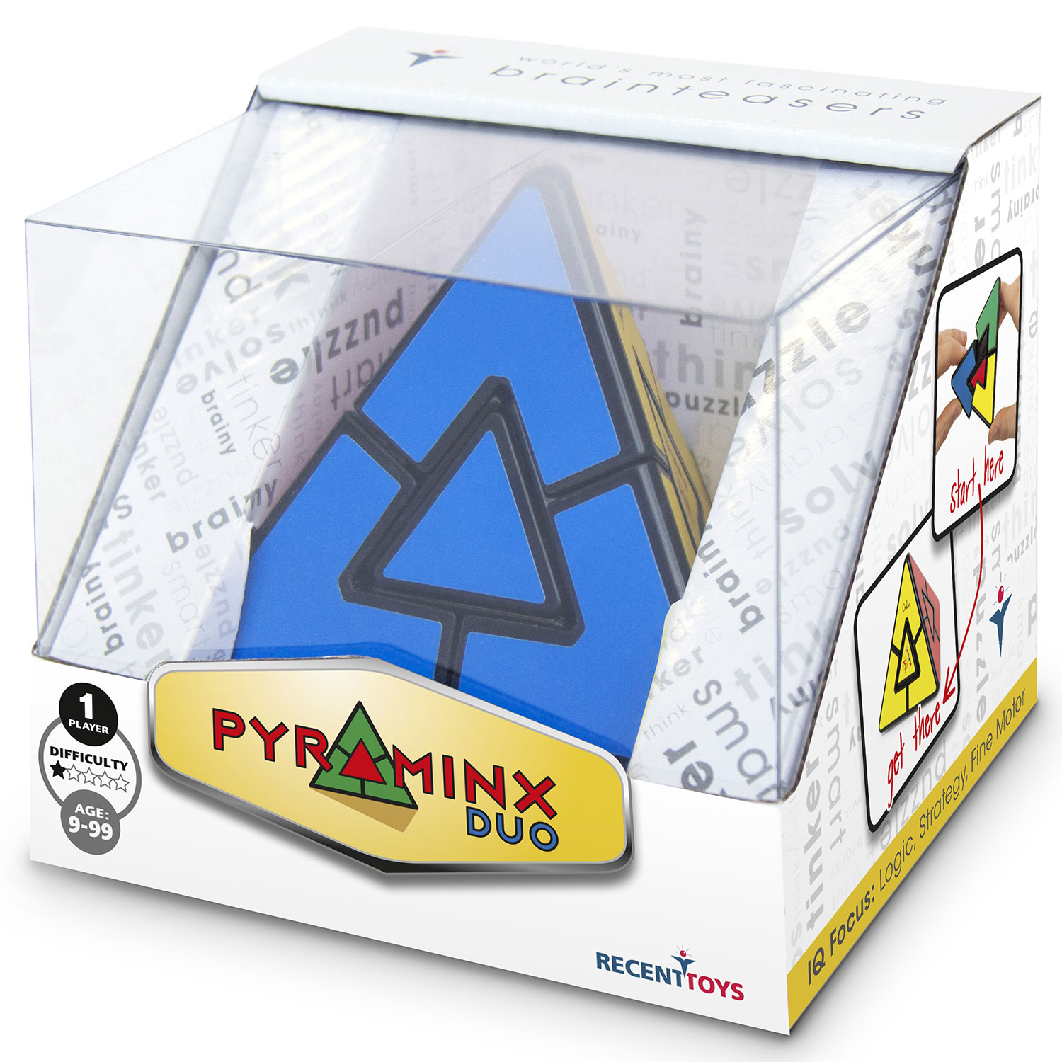 Pyraminx Duo ist der ideale Logiktrainer für Anfänger und jüngere Puzzler (ab 5 Jahren) mit vier Farben und vier Seiten. Die Lösung dieses Rätsels liegt immer nur ein paar Schritte entfernt, aber die Herausforderung besteht darin, die Lösung in nur vier Drehungen zu finden. Nach dem Vermischen der Farben besteht das Ziel in der Gleichfarbigkeit einer jeden Seite.