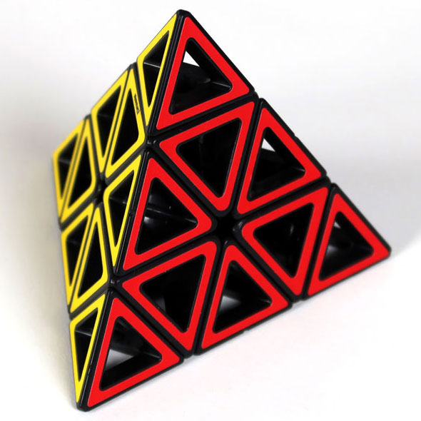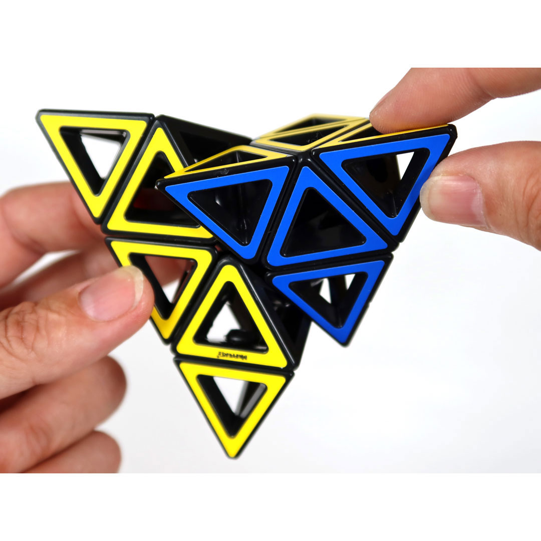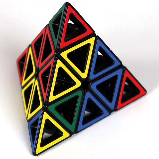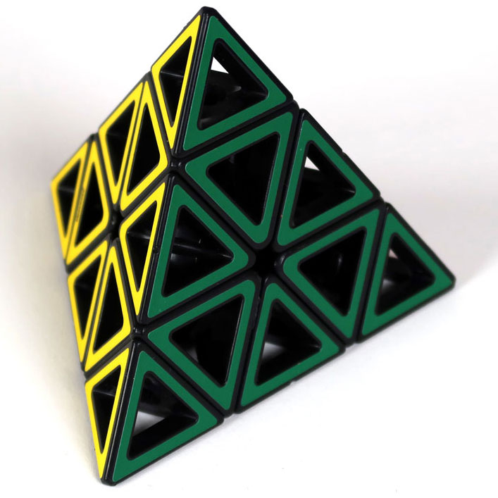 Das etwas andere 3D-Puzzle - Hollow Pyraminx mit offenen Flächen und interessanter Perspektive in das Innere der Pyramide. Das Ziel besteht in der Gleichfarbigkeit einer jeden Seite.