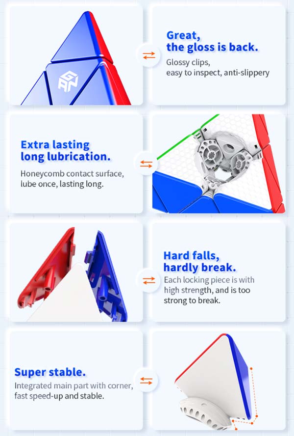 Der GAN Pyraminx ist ein echter Highend Speed Cube. Die Enhanced Core Positioning Edition (ECPE) ist stabil gebaut und ideal für Speed Cubing. Es werde GES Parts mitgeliefert. Der Pyraminx kommt mit folgenden Funktionen: