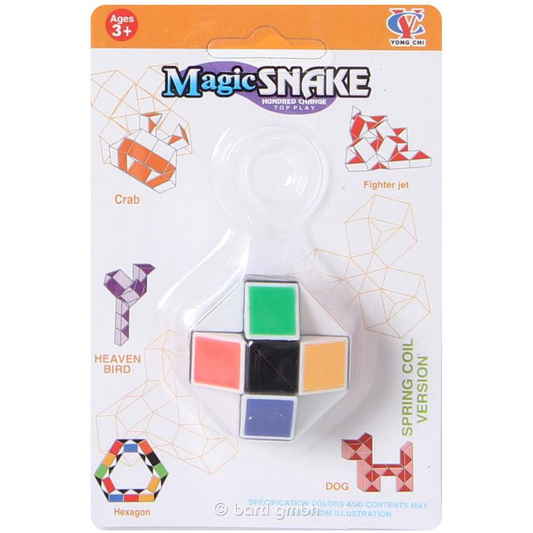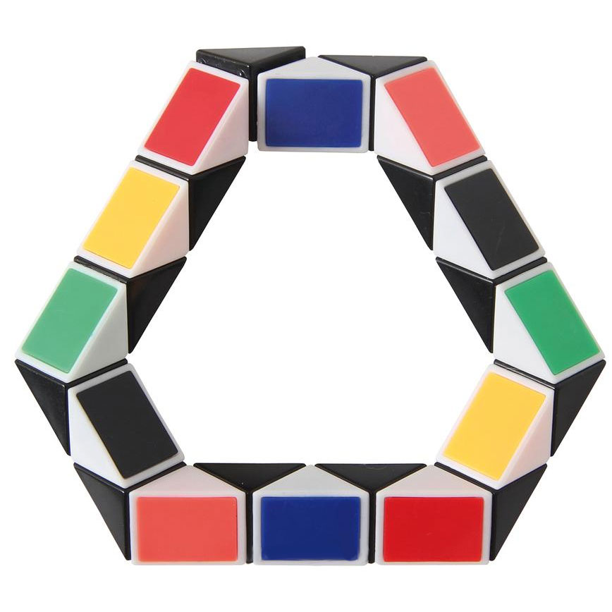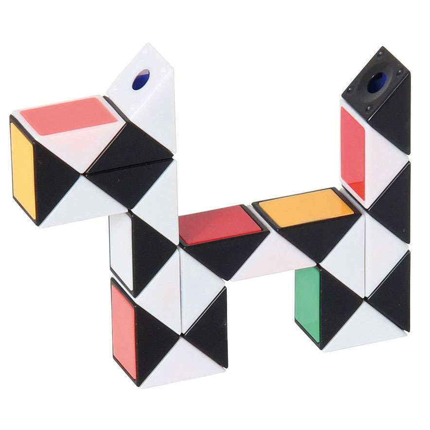 Die Gliederschlange besteht aus 24 Prismen. Dadurch lässt sie sich kinderleicht in unzählige, phantasievolle Figuren puzzeln.