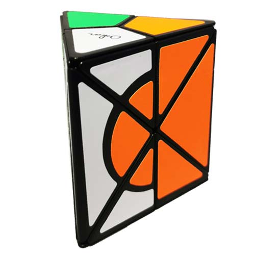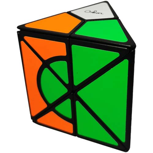 Der MF8 Oskar Jumble Prism in der Version 2. Die Version 1 hat die Farben Blau, Rot und Gelb, die Version 2 die Farben Orange, Grün und Weiß. Der dreieckige Cube hat an den Seiten verschiedene Achsen und lassen den Cube in unterschiedlichste Formen drehen.
