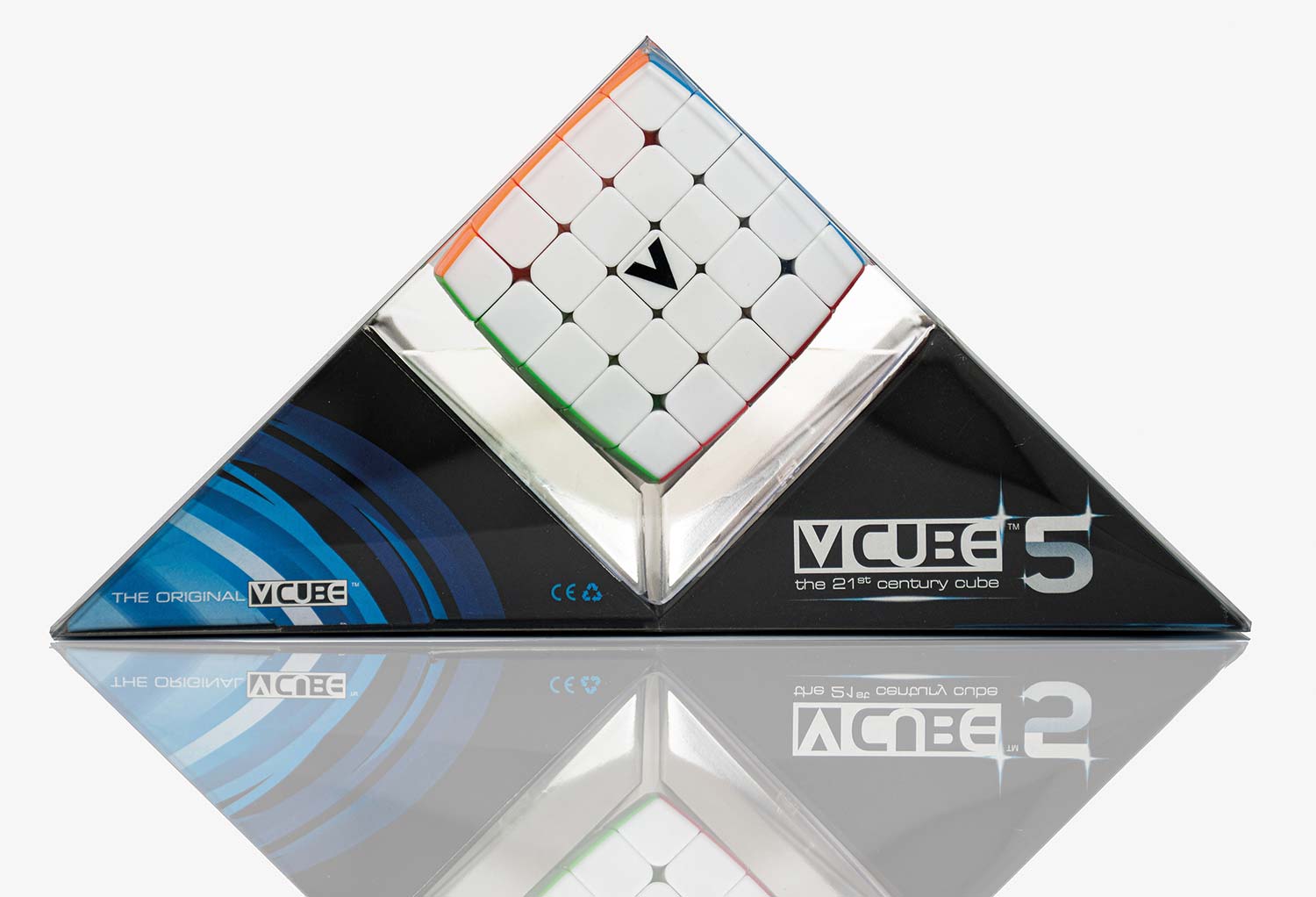 Der V-Cube 5 Essential in der weißen Version ist jeweils in Höhe, Breite und Tiefe in fünf Ebenen unterteilt. Diese lassen sich superleicht drehen. In der Grundstellung hat jede Seite des Würfels eine einheitliche, aber von Seite zu Seite unterschiedliche Farbe. Ziel ist es, den Würfel wieder in seine Grundstellung zu bringen, nachdem die Seiten in eine zufällige Stellung gedreht wurden.