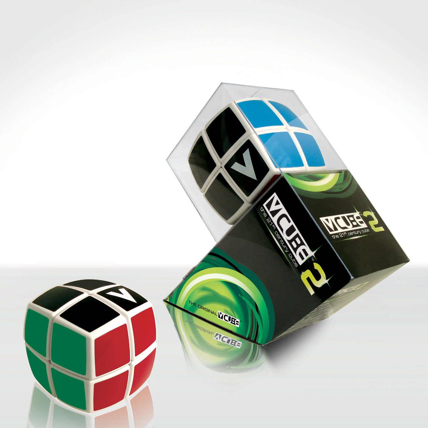 The original V-CUBE! The 21 st Century Cube! Der kleinste aller V-Cubes. Der exklusive Würfel ist jeweils in Höhe, Breite und Tiefe in zwei Ebenen unterteilt. Diese lassen sich superleicht drehen. In der Grundstellung hat jede Seite des Würfels eine einheitliche, aber von Seite zu Seite unterschiedliche Farbe. Ziel ist es, den Würfel wieder in seine Grundstellung zu bringen, nachdem die Seiten in eine zufällige Stellung gedreht wurden.