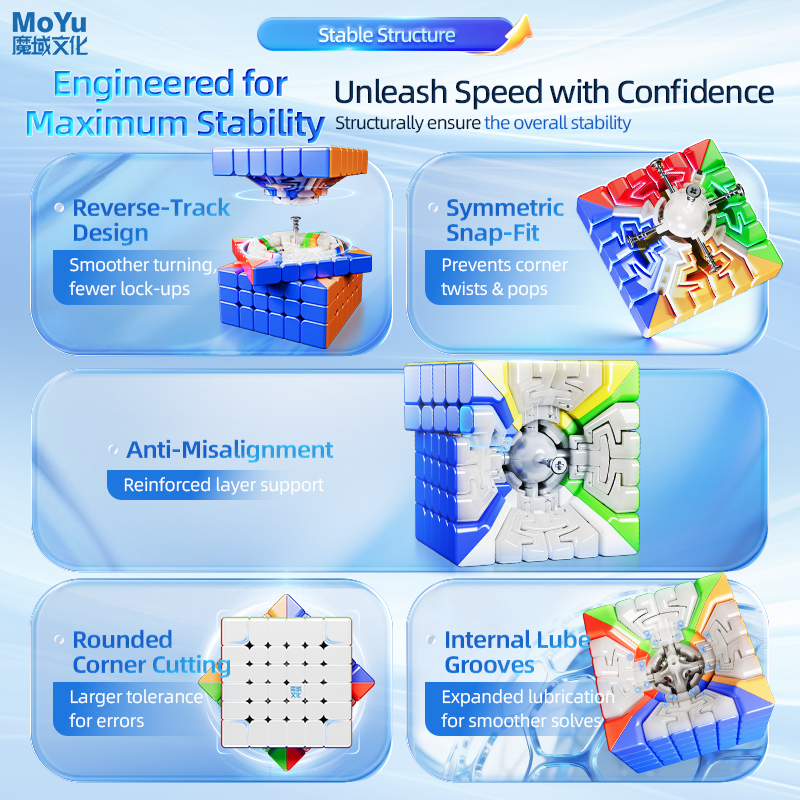 Präzise platzierte Magnete sorgen für saubere Layer-Ausrichtung, reduzieren Lock-ups und ermöglichen gleichmäßige, kontrollierte Turns besonders wichtig bei größeren Cubes.